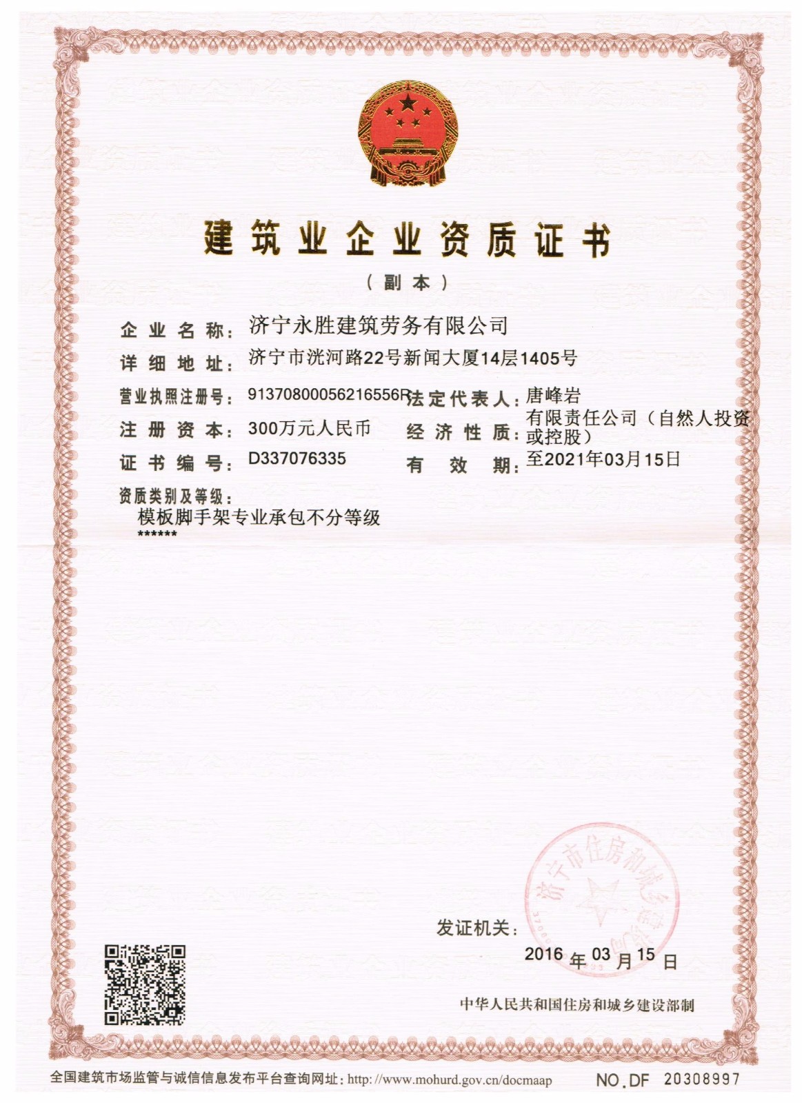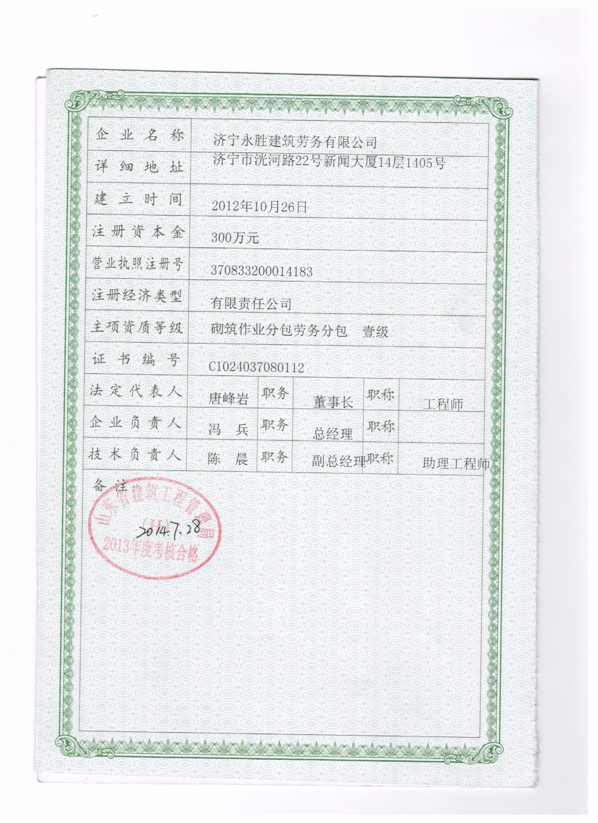 山东永胜建设集团有限公司 地址:山东省济宁市洸河路22号新闻大厦